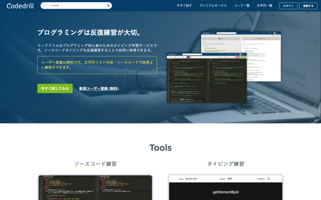 毎日10分!コードドリルはプログラミング初心者のためのタイピング学習サービスです。ソースコードを繰り返し打ちこむことで効率の良いプログラミング練習ができます。